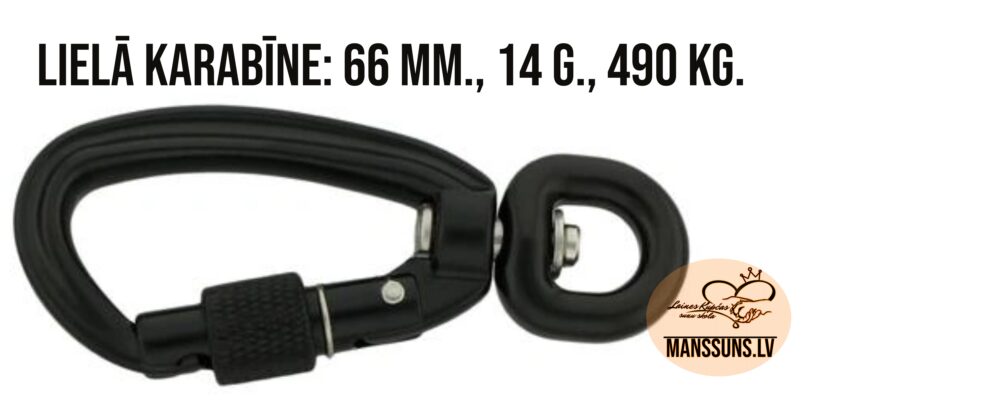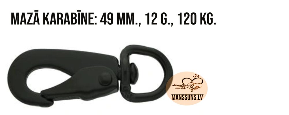 Mūsu karabīnes šobrīd ir pieejamas divos veidos- lielās ar papildus drošības skrūvi pret atvēršanos (alumīnijs, 69 mm., sver 15 g., izturība 490 kg.) un mazās (dzelzs, 49 mm., sver 12 g., izturība 120 kg.). Tās nestrēgst, ja pat tiek lietotas smiltīs (esam lieli jūras pastaigu un pelžu cienītāji- šīs pavadas ir lieliskas vietās, kur ar suni var peldēt, bet nedrīkst atlaist no pavadas). Tās abas ir gana izturīgas- mazā var noturēt arī lielu suni, zvēloties sev piemērotāko, lielāka uzmanība ir jāpievērš suņa krūšu siksnas riņķim, pie kura tiks sprādzēta karabīne- mazākās karabīnes ir ar mazu atvērumu (, tāpēc riņķis nedrīkst būt platāks par 4 mm. (platāks mēdz gadīties pat mazo suņu krūšu siksnām- ieteicams izmērīt!).